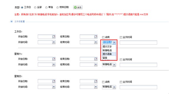 商户可根据自身的作息情况来设置具体的服务时间。有4种模式可以选择,提示文字,转接电话,提示语音及留言。见图
