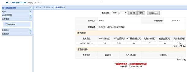 可以查询上月详细帐单和帐户余额等信息。见图