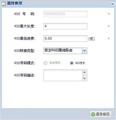 400号码配置→400号码设置→属性修改→400转接类型 选(按主叫归属地路由);见图 此属性修改需联系管理员。
