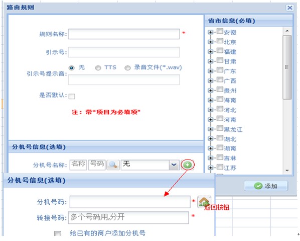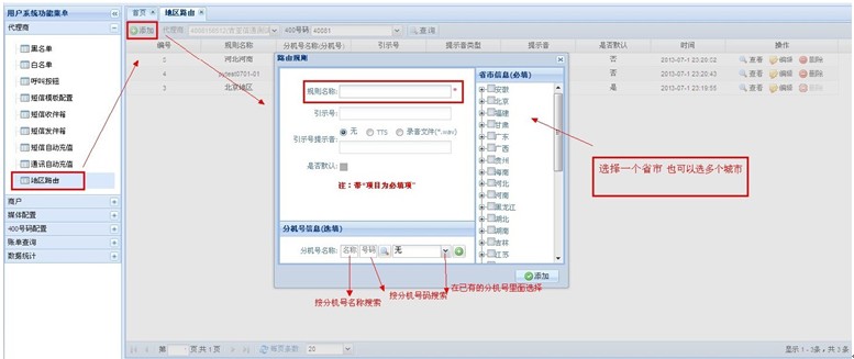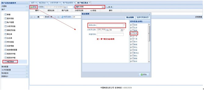2、代理商后台:商户→地区路由→选择商户→添加→规则名称(尽量添加容易区分的,例如:北京、上海、广州等等)→分机号名称(选择要添加的路由分机号)→添加;见图;